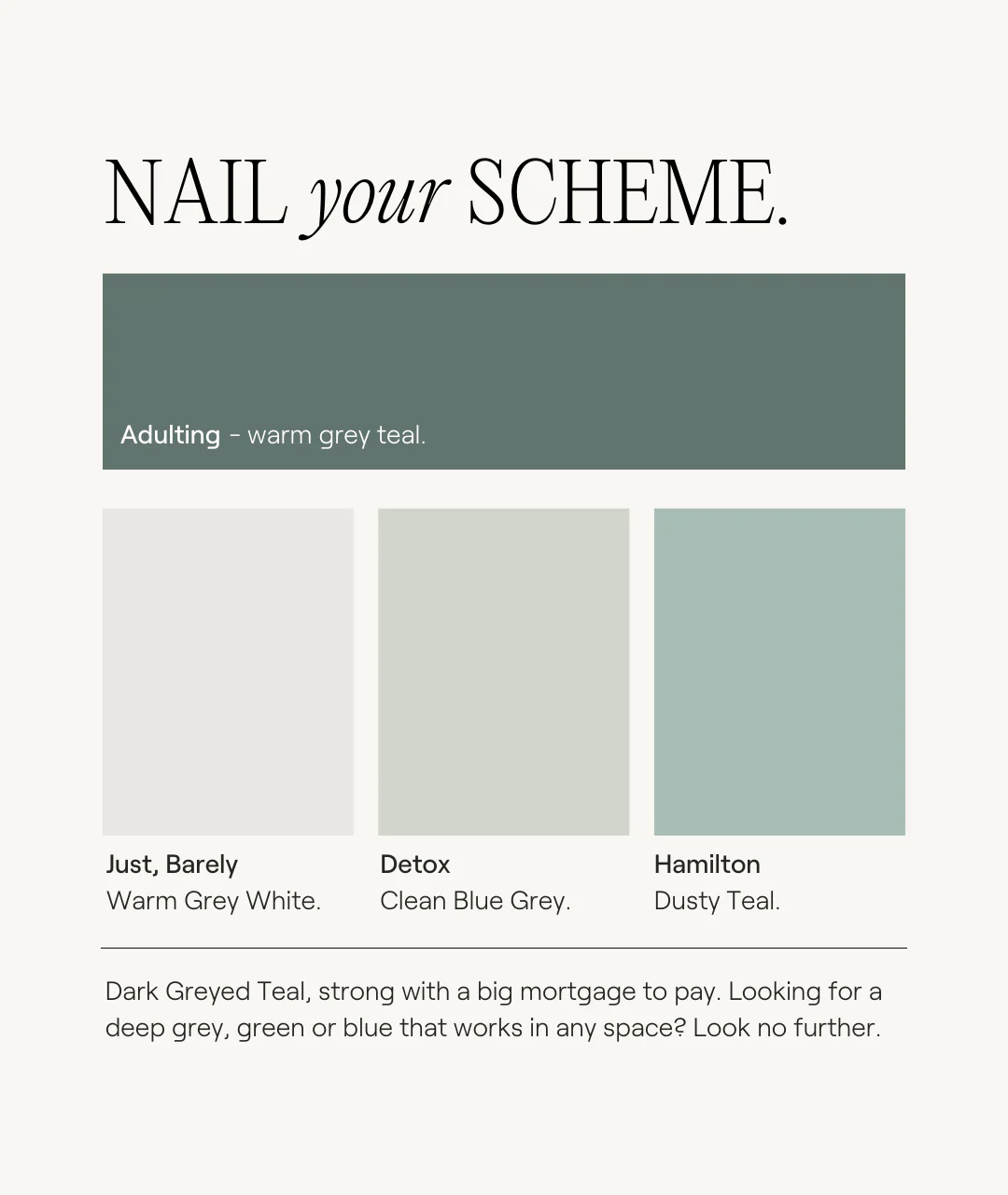 Warm grey teal, it's strong with a big mortgage to pay. If you're looking for a deep grey, green or blue that works in any space - you found it.
