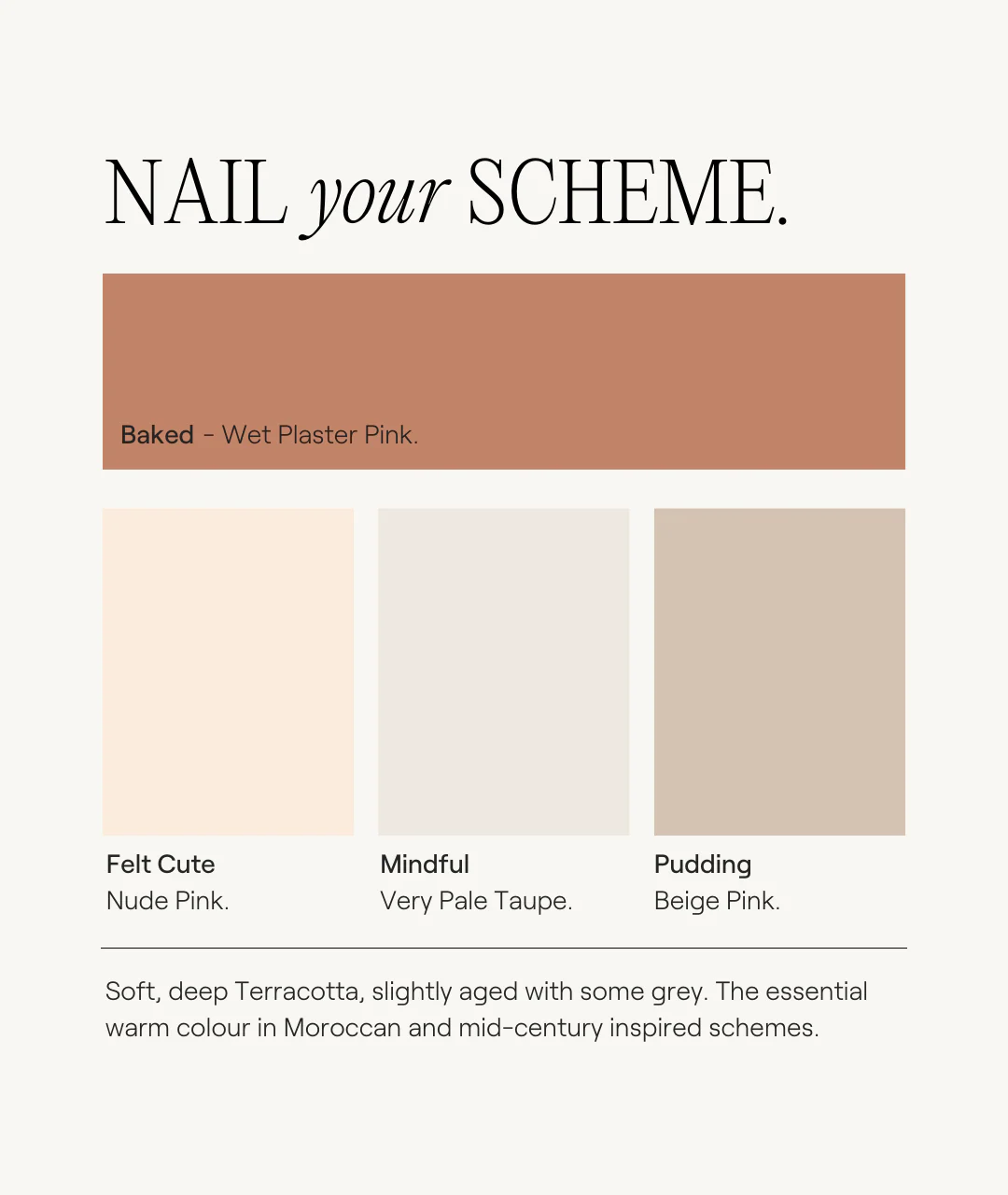 Soft terracotta that's slightly aged with some grey. The essential warm colour in Moroccan and mid-century inspired schemes.