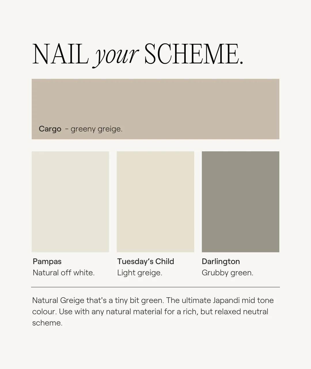 Natural greige that's a tiny bit green. The ultimate Japandi mid-tone colour. Use with any natural material for a rich, but relaxed neutral scheme.