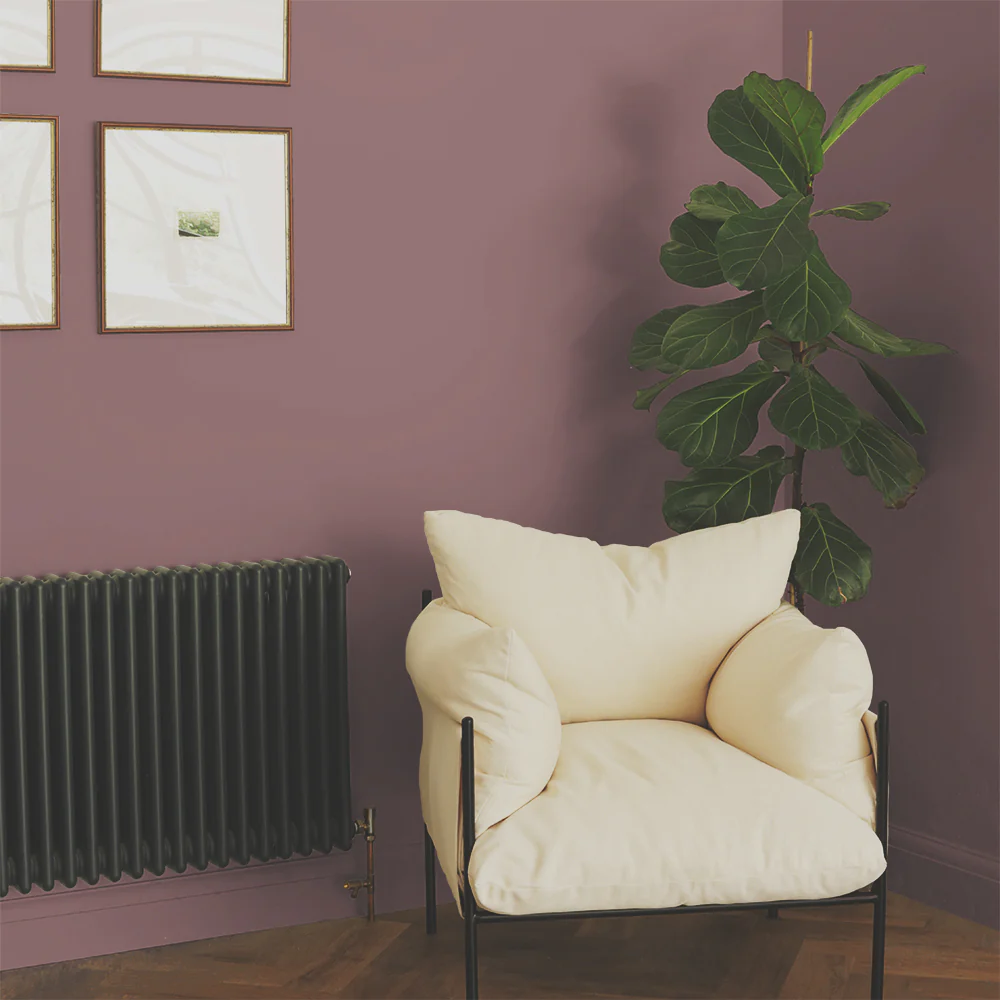 A dusky purplish pink. Use in well lit spaces for a pop of colour, or use in darker spaces where it appears more subtle and relaxed.
