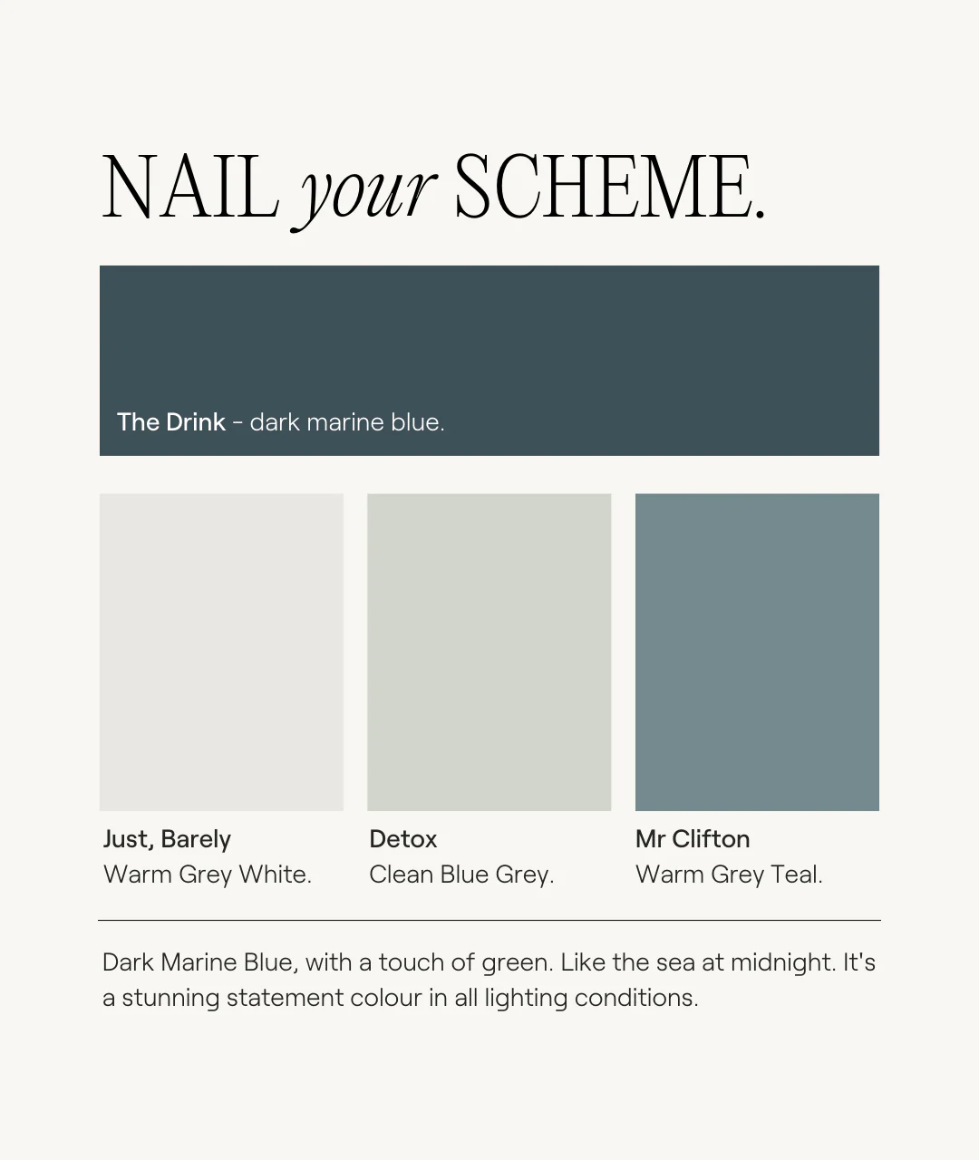 Deep teal, with a touch of green - it's like the sea at midnight. It's a stunning marine colour that works easily in all lighting conditions.
