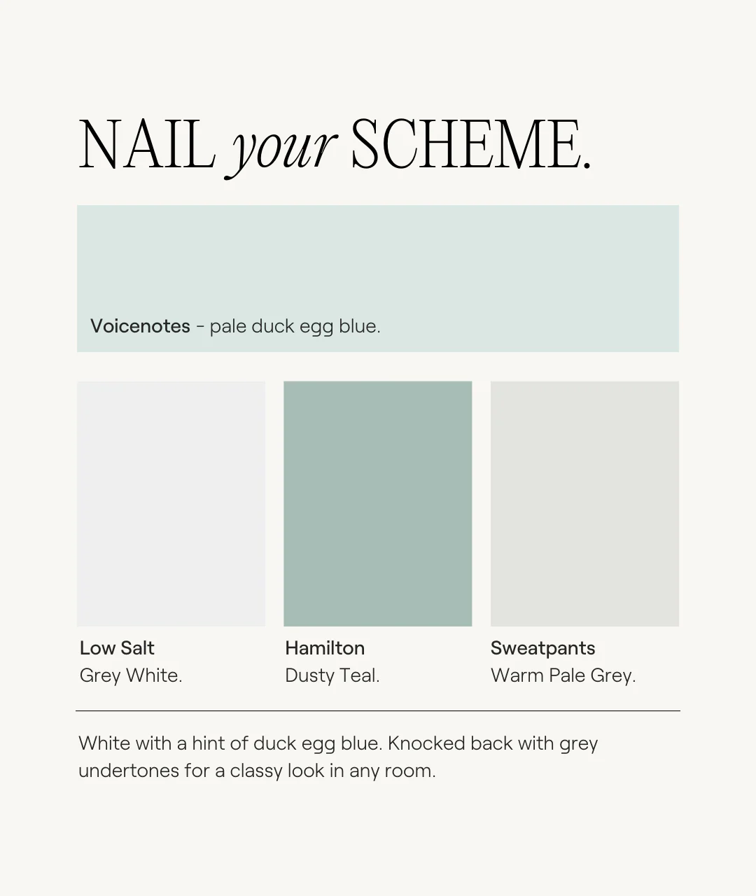 White with a hint of duck egg blue. This unique colour is knocked back with slight green and grey undertones, for a classy look in any room.
